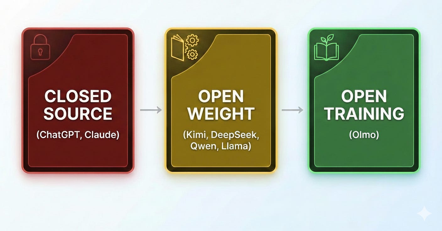 An Open Weight model is like a binary blob. You can look at the weights, you can study what happens inside of it when you use it, but you cannot reproduce it. You have no way to verify how it was created, nor do you know what might be hidden inside its billions of parameters. Not unlike how the CIA might put a sleeper agent in an enemy regime, and waiting years for the perfect time to activate them, sleeper agents can be hidden in the weights. The only way to truly understand and trust a model is transparency into how it was trained (the data, objectives, and post‑training reinforcement learning) such that the process is independently reproducible. Olmo is the best example of an Open Training model.